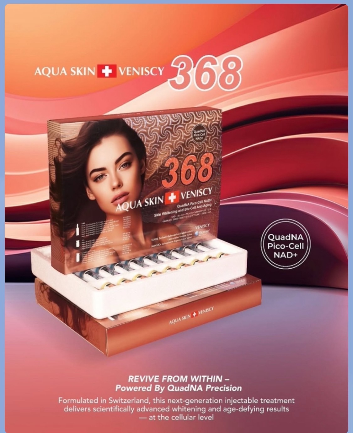 Aqua Skin Veniscy 368 เป็นผลิตภัณฑ์ฉีดกลูตาไธโอนระดับพรีเมียมจากประเทศสวิตเซอร์แลนด์ มีส่วนผสมหลักคือ QuadNA Pico-Cell NAD+ และส่วนผสมอื่นๆ อีก 14 ชนิด มีคุณสมบัติในการฟื้นฟูผิวในระดับเซลล์ ช่วยให้ผิวขาวกระจ่างใส ลดเลือนริ้วรอย และให้ความชุ่มชื้นแก่ผิว เหมาะสำหรับผู้ที่ต้องการให้ผิวขาวกระจ่างใส ลดเลือนริ้วรอย และเพิ่มความชุ่มชื้นให้กับผิว