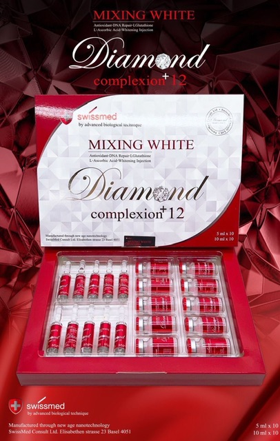 สูตรใหม่พัฒนาจากสูตรเดิม ขาวอมชมพูสูตรฉบับของ Mixing White ประสิทธิภาพเพิ่มมากขึ้นสำหรับปัญหา ผิวใหม้ ผิวแห้งกร้าน ผิวดำคล้ำแต่กำเนิด ส่วนผสมหลักสามารถยับยั้งและพัฒนาได้ต่อเนื่อง ทำให้ผิวหนังยืดหยุ่น ดูย้อนวัยอีกครั้งด้วย L- glutathione 12,000,000 mg ช่วยออกฤทธิ์ยับยั้งการสร้างเม็ดสีมากเกินไปทั่วร่างกาย สัมผัสการเปลี่ยนแปลงได้ใวมากขึ้น หลังใช้เพียง5-7 วัน มีส่วนผสมของวิตามินซี L-ascobic Acid 150,000 mg เป็นส่วนผสมที่ร่างกายต้องการมากที่สุด ช่วยลดเลือนจุดด่างดำต่างๆ ตามร่างกายได้ดีมาก เช่นจุดด่างดำจากสิว จากรอยแดด Cobalamin ช่วยให้ความจำ ระบบปราสาทดีขึ้น ช่วยการนอนหลับพักผ่อนลึกมากยิ่งขึ้น จึงทำให้growth hormone หลั่งได้เต็มที่ ด้วยส่วนผสมที่ลงตัว อัดแน่น ของ Mixing White Diamond Complextion12 จะทำให้เกิดปฏิกิริยาดื้อยาน้อยที่สุด และสามารถป้องกันอนุมูลอิสระได้สูงสุด ซึ่งเป็นสาเหตุที่ให้ดูแก่ก่อนวัย
